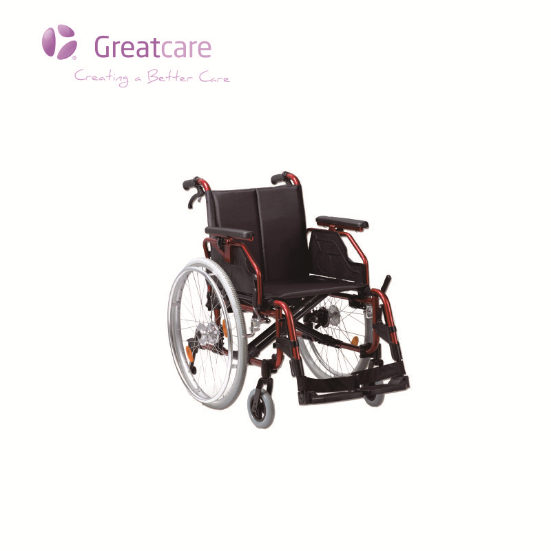 एल्युमिनियम हल्का तौल कुर्सी फ्रेम, फिक्स्ड आर्मरेस्ट, फ्लिप अप फुटरेस्ट, सॉलिड क्यास्टर, न्युमेटिक रियर म्याग व्हील, ड्रप ब्याक ह्यान्डल, लक युनाइटेड ब्रेक।