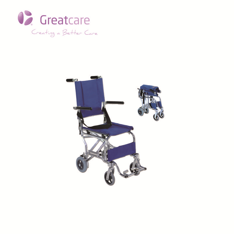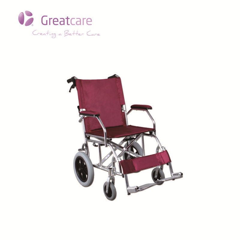 GCW1807LABP | मिनी फोल्डेबल पोर्टेबल एल्युमिनियम कुर्सी फ्रेम, फोल्ड गर्न मिल्ने ब्याकरेस्ट, फ्लिप-अप फुट प्लेट, ठोस क्यास्टर, पेडल लकिङ PU म्याग रियर ह्वील सिट बेल्टसहितको सिट, काफ स्ट्र्याप। |